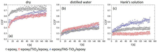 Coefficient of friction under dry sliding. (a) Sliding in distilled water (b) and in Hank’s solution (c) for epoxy, epoxy/FAS-TiO2/epoxy, and epoxy/TiO2/epoxy coatings.