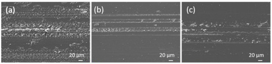 When analysing the wear tracks of the TiO2 coating sliding in water, patches of the accumulated coating material can still be observed. However, these are much smaller and less frequent (Figure 4b) than found for the dry siding. They are still carrying the load, but the friction level is defined by the water film. In the case of the Hank’s solution, a lot of smaller Ti-containing particles can be observed in addition to the load-carrying patches (Figure 4c), which together with the hydrophilic nature of the coating provide a further reduction in the friction.