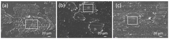 Wear tracks for FAS-TiO2 coating; (a) dry sliding, (b) sliding in distilled water and (c) sliding in Hank’s solution. Squares mark the EDS measurement sites.