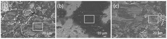 An analysis of the wear tracks is shown in Figure 3, Figure 4 and Figure 5. In the case of the epoxy coating traces of abrasive wear and the accumulation of wear particles within the wear track can be seen for dry sliding, with the formed transfer films carrying the load, and the abrasive wear mechanism being responsible for the friction level of about 0.7 (Figure 3a). Since the investigation was focused on the polymer coatings’ behaviour, all wear experiments were very short, performed within 5 min, with the wear being concentrated within the coating. In the case of TiO2 nanoparticles containing coatings, abrasive wear of the coating followed by coating particles accumulation and transfer film formation is the main wear mechanism. However, in this case coating material starts to accumulate around revealed TiO2 nanoparticles forming larger load-carrying low-friction patches (Figure 4a). Similar patches were also observed for the FAS-TiO2 coating; however, in this case the patches seem more compact (Figure 5a), taking longer to form and having a higher shear strength and thus resulting in higher friction. The EDS analysis of the patches confirmed an increased concentration of Ti within the patches, which was true for both coatings, as shown in Figure 6.