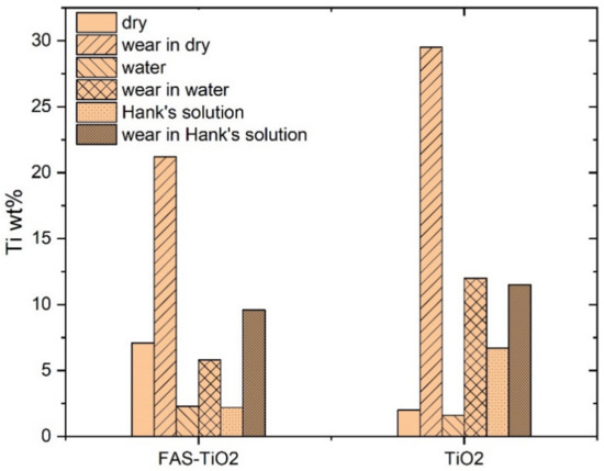 Ti wt.% before and after the tribological experiments in dry conditions, distilled water and Hank’s solution on epoxy/FAS-TiO2/epoxy and epoxy/TiO2/epoxy coatings, as determined by the EDS analysis. The sites of the EDS measurements for the worn surfaces are marked with squares in Figure 4 and Figure 5.