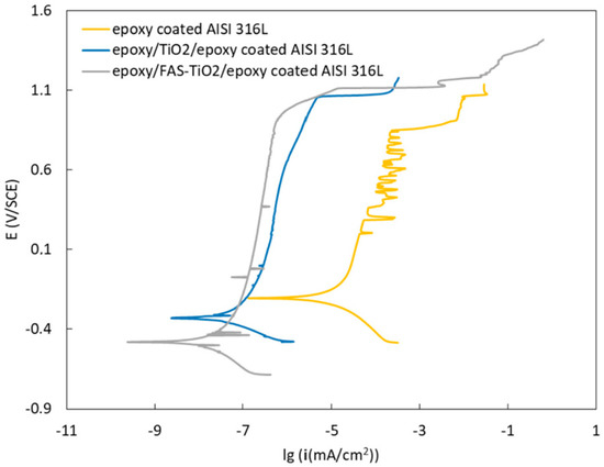 We studied the potentiodynamic behaviour of the epoxy/FAS-TiO2/epoxy, epoxy/TiO2/epoxy and epoxy coatings on AISI 316L stainless steel in Hank’s solution (Figure 7). The quantitative results of the potentiodynamic measurements are presented in Table 2. We calculated the corrosion rate (vcorr) and the corrosion current density (icorr) according to ASTM G102-89 [29]. The surface modification greatly influenced the polarization and the passivation behaviour of the substrate. The corrosion potential (Ecorr) for the epoxy coating was approximately −204 mV vs. SCE. After the Tafel range, the specimen displayed a wide passive region, followed by the breakdown potential (Eb) at 800 mV vs. SCE. The corrosion rate was 0.23 µm/year. To achieve improved corrosion properties, we prepared coatings by the addition of the as-received and surface-modified TiO2 nanoparticles. The increased corrosion resistance of these samples was observed with a significantly wider range of passivation, which was shifted to lower corrosion-current densities (icorr). For the epoxy/TiO2/epoxy-coated AISI 316L sample, the Ecorr was −329 mV vs. SCE and the Eb was shifted to 1000 mV vs. SCE. The corrosion rate was 0.8 nm/year. For the epoxy/FAS-TiO2/epoxy-coated AISI 316L sample, the Ecorr was −479 mV vs. SCE and the Eb was 1000 mV vs. SCE. The corrosion rate was 0.4 nm/year. The results show the significantly improved corrosion resistance of the AISI 316L stainless steel after the addition of nanoparticles to the epoxy coating compared to the pure epoxy coating; this effect was especially noticeable for the hydrophobic epoxy/FAS-TiO2/epoxy coating. The key advantage is the presence of nanoparticles within the coating, which inhibits the permeation of aggressive ions and increases the corrosion performance of the substrate.