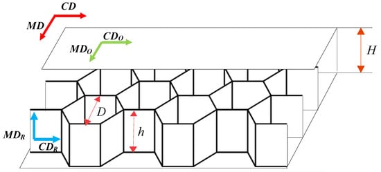 Cellular cardboard has the characteristics of orthotropic bodies. This is due to the core structure and the distribution of mechanical properties of the flat layers, which is characteristic of orthotropic bodies. In the plane of cellular paperboard, two main directions of orthotropy can be distinguished. The first one coincides with the direction of manufacture and it is called machine direction, MD. The second main direction, perpendicular to the machine direction, is referred to as cross direction, CD. The main directions of the CD and MD of the paperboard coincide with the main directions of the paper used for the flat layers of the CDO and MDO paperboard (see Figure 1). In the case of a paperboard core, the machine direction of the paper used for the MDR core is parallel to the height of the core and the cross direction CDR is perpendicular to the height of the core.