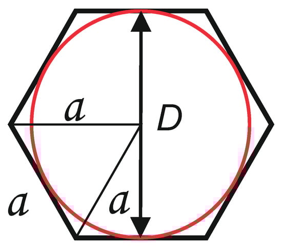 The length of the regular hexagon’s side can be determined from Equation (1) using parameter D given by the paperboard manufacturer (see Figure 2):
