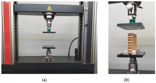 ECT measurements were made using a universal Zwick testing machine (Ulm, Germany) with a load range up to 20 kN using the tooling shown in Figure 3. The tooling consists of two square plates of 144 cm2 each. Both plates are rigidly attached to the lower frame of the machine, and the upper to the movable traverse (see Figure 3a). Supporting blocks (see Figure 3b) were used to test cardboard with small thickness, maintaining the tested piece in a vertical position until reaching the initial force.