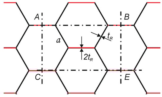 In the case of a regular hexagon cell that has been taken into account in the calculations, the angle γ is 60°. It was assumed that only single-thickness walls are responsible for cell destruction in the ECT test, tR marked in black in Figure 4. The double walls tR, which are formed by gluing two layers of core material marked in red in Figure 4, are not damaged, as observed in preliminary ECT tests of honeycomb panels.