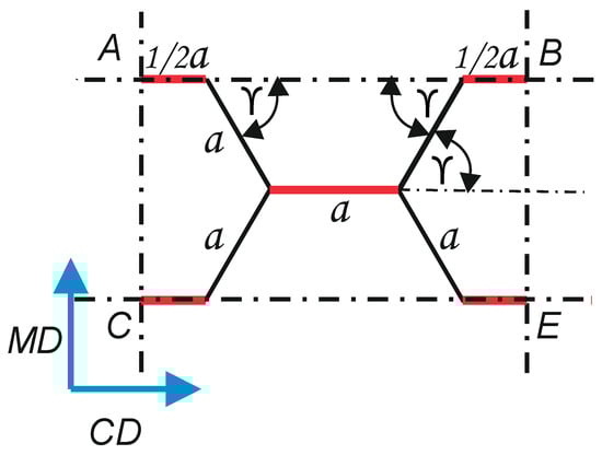It was assumed that the calculation model of the resistance to edge crushing of the core will describe the destruction of a repeating element of the paperboard core structure. The ABCE periodic cell was separated from the honeycomb core structure (see Figure 4).
