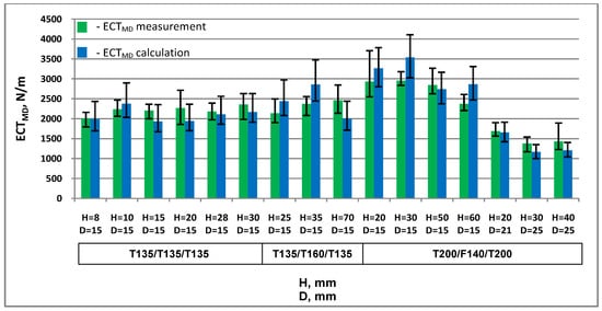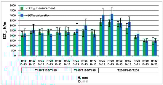 The largest discrepancy between the measured and calculated values was in the MD direction: 20% of the actual ECTMD value and in the CD direction 24%. The largest ECTMD discrepancy was found in the case of cardboard with mesh size D = 15 mm, thickness H = 60 mm, made of T200 and F140 papers. The largest discrepancy between the calculated and measured ECTCD values was in the case of paperboard with mesh size D = 15 mm, thickness H equal to 30 mm, made of T200 and F140 papers. The mean value of the discrepancy between the measured and calculated ECT values in all the cases examined was 11% of the actual value in both MD and CD.
