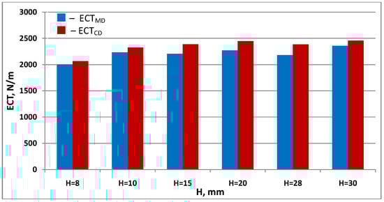 In both cases, at low core heights, up to 20 mm, there is an increasing tendency for greater edge crush resistance as the cardboard thickness increases. Then, the ECT value remains at the same level. This is due to the fact that as the value of the a/h decreases, the influence of the core on the ECT of the paperboard decreases, striving for a constant value.
