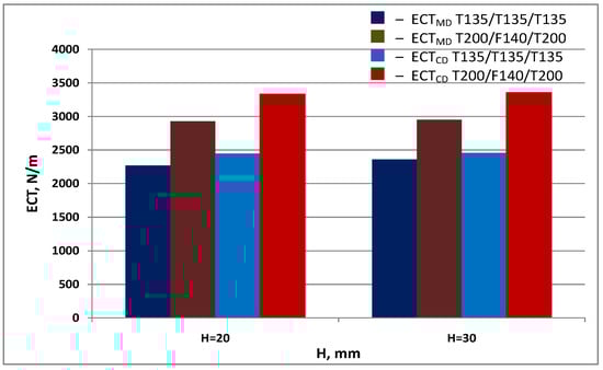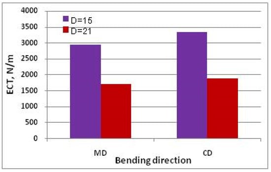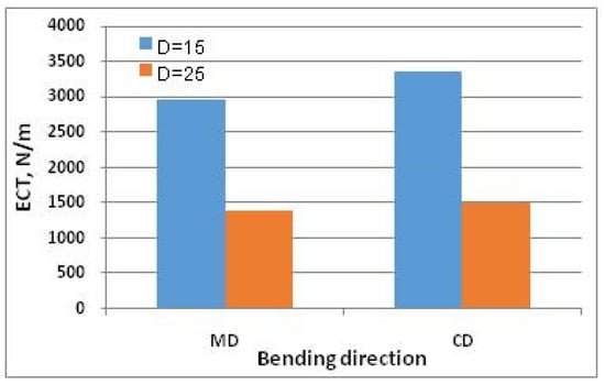 The measurement results illustrated in Figure 10 show the effect of physical properties of the papers on the ECT of cellular board. The use of a paper with a higher basis weight, and thus higher thickness and better mechanical properties, causes a significant increase in the ECT value in both machine and cross directions.