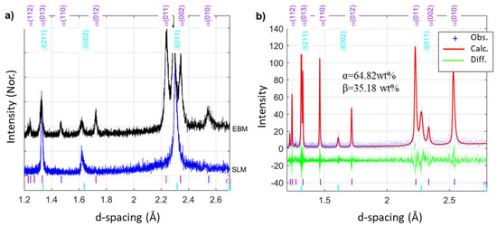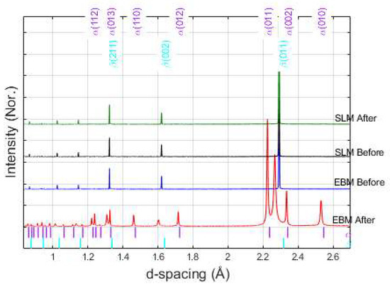- Maimaitiyili, T.; Woracek, R.; Neikter, M.; Boin, M.; Wimpory, R.C.; Pederson, R.; Strobl, M.; Drakopoulos, M.; Schafer, N.; Bjerken, C. Residual Lattice Strain and Phase Distribution in Ti-6Al-4V Produced by Electron Beam Melting. Materials 2019, 12, 667. [Google Scholar] [CrossRef] [PubMed]
