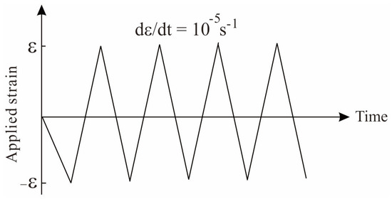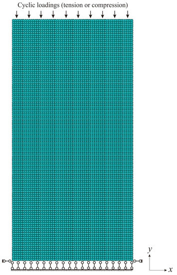 The sample used for fatigue simulation is 3 mm × 6 mm, as shown in Figure 1. Tension-compression cyclic loading is applied on the top end of specimen with the loading direction along y direction. In addition, Figure 1 shows the boundary condition in the FEM framework. Here, confinement is applied on the bottom line to prevent it from moving along the y direction. Besides, two ending points of the bottom line are fixed in the x direction. The well-meshed sample possesses 7200 elements and CPS4R (element type) is employed for all the samples. Besides, loading rate is fixed at 10−5 s−1.