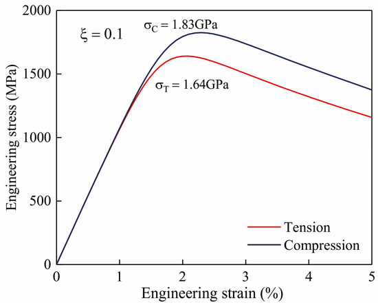 The simulated engineering stress-strain curves under uniaxial tension and compression are illustrated in Figure 2. Results show that the simulated yield strengths are 1.64 GPa and 1.83 GPa for tensile and compressive loading, separately. Here, engineering stress is calculated by the ratio of all the forces applied on the top end of sample (see Figure 1) to the top end area. Comparison with experimental results in reference [20] elucidates that the current parameters are good enough to be precisely describe the mechanical response for metallic glasses under uniaxial loadings. Because of the presence of compressive hydrostatic stress, the free volume is hard to be localized in terms of the suppression caused by multiple stress states, leading to a higher yield strength under compression. On the other hand, for both curves under tension and compression, there exists a declining part which follows the elastic and plastic stage. This descending part is the resultant effect of softening induced by free volume localization [18,19]. Doubtless, the softening process could also result in the damage behavior for metallic glass under cyclic loadings which will be discussed in detail below.