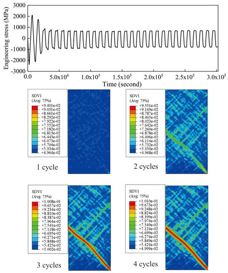 Actually, shear band is not a crack. There is an evolution process from shear band to crack. Since the crack is quite different from shear band, it could expected that a crack may affect the evolution of shear bands and the results could differ if the crack is separately incorporated in this model (for example, if surface separation is included in the model). Hereby, only shear band is modeled. In order to clearly understand the mechanical response and shear banding evolution under cyclic fatigue loading, Figure 4 shows the dependence of engineering stress on the total loading time, by taking the case under a strain amplitude ε 2.50% for instruction. It can be seen that the stress in the beginning is relatively high since there is no damage being caused. Along with the increasing time, stress fluctuates firstly with a descending amplitude. After about 3 cycles, the stress amplitude becomes stable and does not drop again. It could be understood that the declining amplitude in the first stage could be attributed to the cumulative damage in metallic glasses. That is: for longer times in this stage, stronger damage could be accumulated, leading to a lower bearing capacity. However, after certain cycles, since there is no damage being continuously accumulated, the stress becomes stable. Then the cycle number at which the stress becomes stabilized could be denoted as the fatigue limit according to reference [13]. Furthermore, careful observations could conclude that the stress under compression is higher than that under the corresponding tensile loading. This could be explained by the hydrostatic stress effect, which could be seen from the curve in Figure 2. Under compression, compressive hydrostatic stress could limit the formation of free-volume localization and bring up a relatively larger stress.