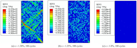By using the method in Section 4.3, the fatigue limits under different strain amplitudes could be determined as long as the correlation of engineering stress and time is obtained. It should be pointed out that the ultimate fatigue limit in this work is assumed to 100 cycles according to investigation in reference [13]. Computation will be forcedly stopped if the sample is not able to be entirely damaged after 100 cycles in order to save computing time. Then, Figure 5 displays the relationship between engineering stress and the total time during fatigue process. As in the trend in Figure 4, stress amplitude firstly decreases, and then becomes steady when the fatigue limit is reached. With a larger strain amplitude, a lower fatigue limit could be found. However, for the samples with strain ε = 1.30%, 1.25% and 1.0%, there is no descending part found in curves, meaning that fatigue limit of these specimens is higher than 100 cycles. Besides, from all the curves, it could be realized that the compressive stress is higher than the tensile stress in the same loop, demonstrating a distinct asymmetry of tension and compression which is caused by the hydrostatic stress. This feature is different from the work in reference [13] in which no hydrostatic stress is considered.