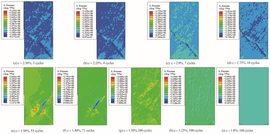 Hydrostatic stress distribution (described by “pressure” in ABAQUS) at fatigue limit or 100 cycles. (a) ε = 2.50%, 3 cycles; (b) ε = 2.25%, 4 cycles; (c) ε = 2.0%, 7 cycles; (d) ε = 1.75%, 16 cycles; (e) ε = 1.50%, 53 cycles; (f) ε = 1.40%, 71 cycles; (g) ε = 1.30%, 100 cycles; (h) ε = 1.25%, 100 cycles; (i) ε = 1.0%, 100 cycles. In which, the unit of pressure is actually denoted as in which is 225MPa (according to the deduction process in reference [19]).