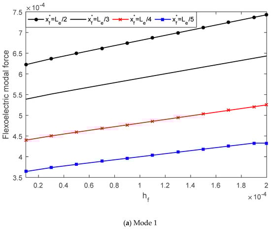The effect of the flexoelectric patch thickness on the flexoelectric modal force, (a) mode 1, (b) mode 3.
