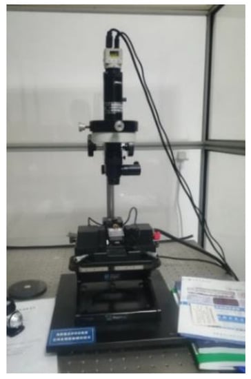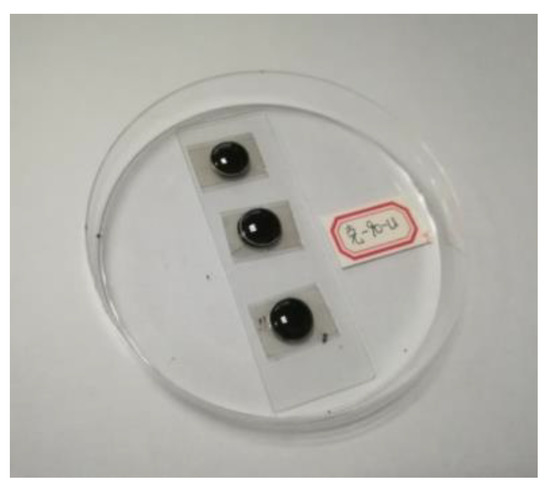 Asphalt samples were prepared as follows. First, a rectangular mica piece 18 mm in length, 13 mm in width and 0.1 mm in thickness was placed on a glass slide, and then an iron ring with an outer diameter of 10 mm, an inner diameter of 8 mm and a height of 1 mm was placed on the mica piece. Second, the asphalt heated to 150–160 °C was dropped into the iron ring and then placed in a 150 °C oven for 20 min to make the asphalt surface smooth and flat. Then, the asphalt sample was removed from the oven together with the base and the iron ring, and the asphalt sample was placed into a plastic dish with a sealed cover to allow the sample to cool to room temperature. The sample was then placed in a sealed plastic dish before testing to prevent dust from contaminating the surface and affecting the test results. The prepared asphalt samples are illustrated in Figure 1. For each type of asphalt, three samples were prepared and tested in parallel.