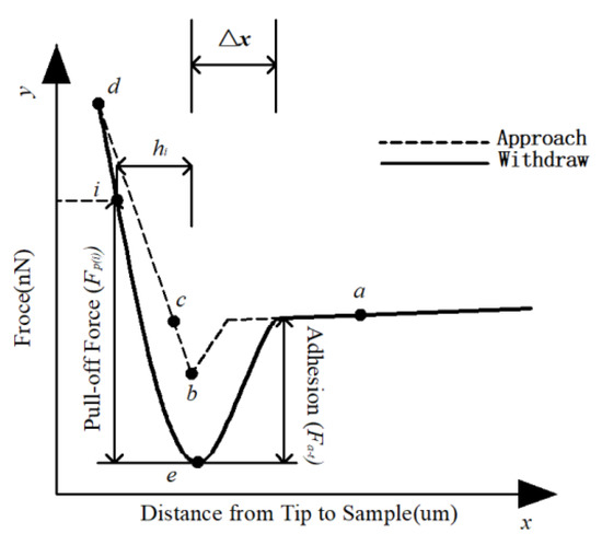 In this study, the penetration depth of probe (the abscissa of point d of force curve) w set in AFM test. However, if the penetration depth is too large, the probe not only is attracted by the asphalt surface, but also affected by the internal adhesion of asphalt, and the force curve of asphalt surface will be disordered. Therefore, according to different positions of asphalt, the set position d is different, so that the probe does not press into the too deep position of asphalt and is affected by the internal adhesion of asphalt, and does not affect the calculation of the adhesion of asphalt surface, which reduces the experimental error.