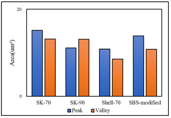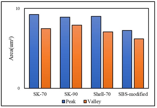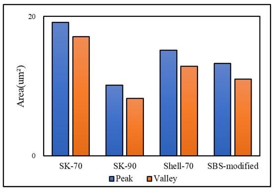 The bee-like structure of the asphalt surface can be observed by AFM (Figure 5), and the results show that this structure affects both the micro-morphology of the material surface [37,38,39] and the micro-mechanics of the asphalt [40]. Therefore, it is necessary to investigate the effect of the bee-like structure on the surface energy. Figure 6 shows an image of the observed bee-like structure, which was imported into MATLAB to calculate and count the area of the bee-like structures in the image, the results of which are shown in Figure 7. The image shows that, while there are bee-like structures in the SK-70, SK-90, Shell-70 and SBS-modified asphalts, the number and area of bee-like structures are significantly different. KL-70 has no bee-like structures. A bee-like structure is a special feature in asphalt micro-surface.
