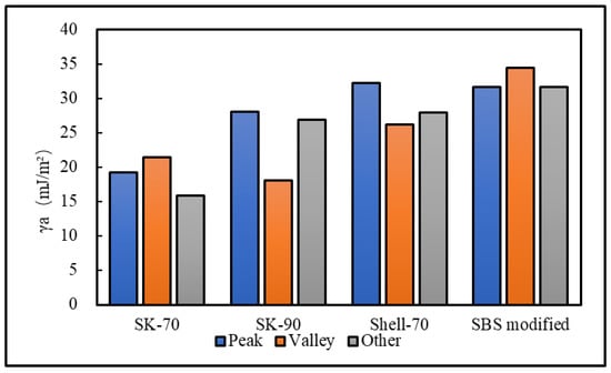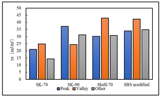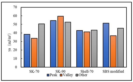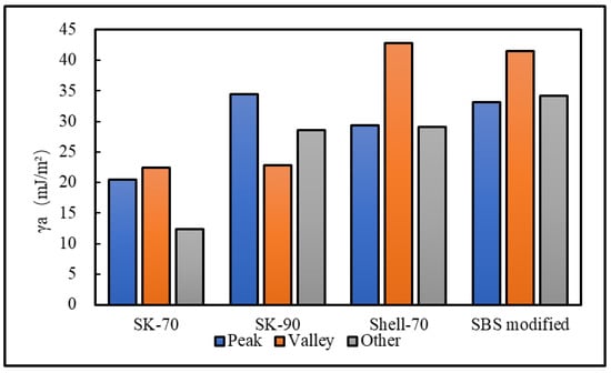 The results demonstrate that the surface energy of SK-90 asphalt is higher than that of SK-70 asphalt when the oil source is the same and the grade is different. When the grade is the same and the oil source is different, the surface energy ordering is Shell-70 > SK-70 > KL-70, i.e., the surface energy of modified asphalt is higher than that of matrix asphalt, and the surface energy of KL-70 asphalt without a bee-like structure is the lowest. According to the analysis of the five types of asphalt, as shown in Figure 6, the microstructures of asphalt are quite different. The special morphology of the bee structure on the asphalt surface inevitably has an impact on the asphalt micro-adhesion properties, therefore explaining why the surface energy of KL-70 without a bee-like structure is the lowest. The area, quantity and dispersion of the bee-like structures in the SBS-modified materials are greater than those in the other asphalt; thus, their surface energies are higher. The surface energy of the SBS-modified is the greatest because this type of asphalt is primarily composed of non-polar hydrocarbons. After SBS is added, the light oil components are absorbed by SBS, with some of them transforming into gum and asphaltene materials, which have strong polarity and high viscosity [41]. Therefore, the polar components of SBS-modified asphalt increase and the adhesion work produced by the polar components is greater, which effectively improves the adhesion between the asphalt and aggregate.