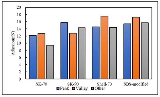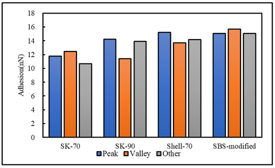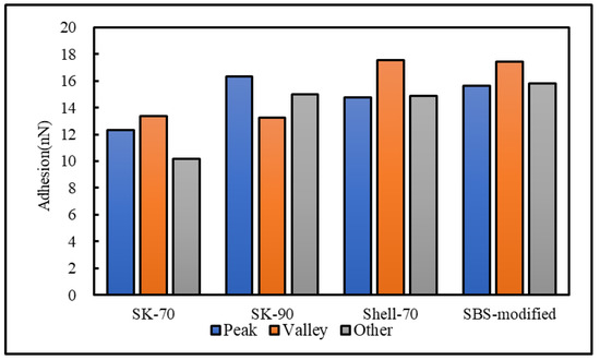 In the tests, nine force curves were obtained for each type of asphalt, for three regions, namely the bee peaks, valleys and other areas. The average value of the calculated surface energy was taken as the test result and the influences of the asphalt type, aging and soaking on the surface energy were analyzed. Considering the area proportion of the bee-like structure, the adhesion and surface energy values of the bee-like structure and other areas, the total adhesion and surface energy of the asphalt surface were calculated according to Equations (4) and (5).