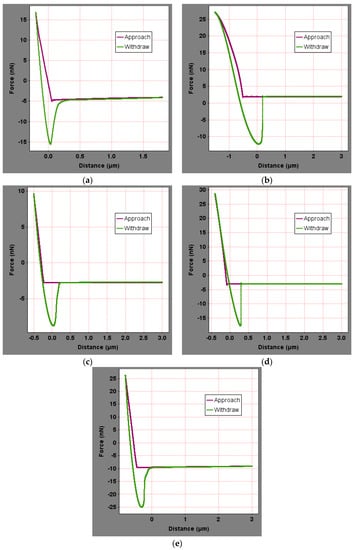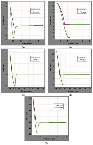 Force curves of the other regions of the bee-like structures in soaked asphalts: (a) SK-70; (b) SK-90; (c) KL-70; (d) Shell-70; and (e) SBS-modified.