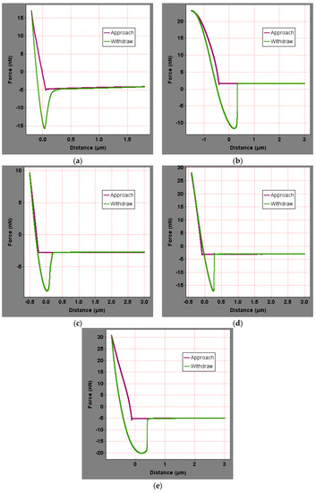 The contact mode was used to measure the force curve between the probe and asphalt. There is an attraction between the atoms in the AFM probe tip and the atoms in the sample, and the attraction of various samples is different. From the force curve (such as in Figure 3), the adhesion between the sample and the probe can be measured, wherein the a–b–c–d path corresponds to the approach curve and the d–e–a path corresponds to the withdrawal curve. When the probe approaches the sample from a, the sample and probe are attracted together at b. As the probe continues to press in (b–d), the sample elastically deforms. After the probe reaches the set position d, the scanner moves in the opposite direction, and the probe begins to retreat (d–e–a). During the retrogression process, the probe atoms and the sample experience pull-off forces under the action of gravity, and the pull-off process ends when the probe reaches position e, after which the probe is kept away from the sample, but there is still adhesion between the probe and the sample until returning to its original position a.