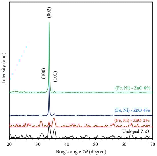 XRD (Malvern Panalytical Ltd, Malvern, UK) is used to study the crystalline nature of undoped ZnO and (Fe-Ni) co-doped ZnO thin films. Figure 1 shows the XRD patterns of ZnO and (Fe-Ni) co-doped ZnO thin films annealed at 500 °C for 2 h. The main peaks of undoped ZnO thin films are observed at Bragg’s angles of 31.31°, 33.87°, and 35.69°, corresponding to ZnO crystallographic planes indexed by Miller indices of (100), (002), and (101), respectively. Comparison of the observed and standard “” values () planes as matched with JCPDS cards no. 036-1451 and 071-3830, indicates that ZnO thin film is polycrystalline and exhibit wurtzite hexagonal structure [22,23]. Inspection of the XRD patterns of (Fe-Ni) co-doped ZnO thin films grown with 4% and 8% (Fe-Ni) concentration levels show that (002) crystallographic orientation attains the highest intensity. This is due to the grain growth associated with (002) preferred orientation and/or increase in the degree of crystallinity upon introducing 4% and 8% Fe-Ni in ZnO thin films. Moreover, Figure 1 shows a slight shift of all diffraction peaks toward the lower diffraction angles () as (Fe-Ni) concentration level increases. In order to get a deeper insight into the diffusion of different species in the interstitial slots of ZnO thin films, we calculate the atomic and ionic radii of Zn2+, Fe2+, and Ni2+ ions and found them to be 1.42 Å, 1.35 Å, 1.40 Å, 1.06 Å, 1.35 Å, and 0.83, respectively. Subsequently, it is easy to figure out that upon introducing Fe-Ni ions in ZnO thin films, Zn2+ and Fe2+ ions diffuse in the interstitial spaces between Zn2+ and O2− ions leading to the shift of the positions of XRD peaks.