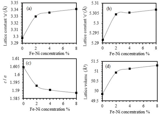 Lattice constants ( and ), the ratio of () and the lattice volume () determined from X-ray diffraction pattern of the undoped ZnO and the Fe-Ni co-doped ZnO thin films as a function of (Fe-Ni) concentration. (a) In-plane lattice constant a as a function of (Fe-Ni) % concentration. (b) Out-of-plane lattice constant c as a function of (Fe-Ni) % concentration. (c) Axial ratio (c/a) as a function of (Fe-Ni) % concentration. (d) Lattice volume (V) as a function of (Fe-Ni) % concentration.
