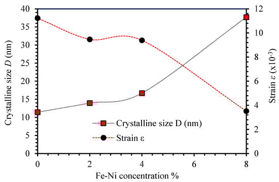 For a crystal to become perfect, it has to expand to infinity in all dimensions. Such expansion produces XRD line-patterns rather than XRD peaks. Therefore, no crystal is ideally perfect because of its finite size that causes the XRD line-patterns to broaden and produce peaks rather than lines [31]. The crystallite size and lattice strain are the main characteristics extracted from the peak width, intensity and shift the 2θ peak position. Crystallite size is the size of the coherently diffracting domains. The formation of polycrystalline combinations makes the crystallite size of the particles different from the particle size [32]. The average crystalline size can be calculated from Debye Scherrer’s formula [24,33], where is the crystallite size, is the wavelength of the X-ray (), is the full width at half maximum (FWHM) after correcting for instrumental peak broadening (β expressed in radians), is Bragg’s angle and is Scherrer constant. The value of depends on the shape of the crystal, the diffraction line indices, and the dispersion of the crystalline sizes of the powder [34,35]. Usually, is typically between 0.8 and 1.39 and for the spherical particles is nearly 0.94. Lattice strain or micro strain is a measure of the distribution of lattice constants arising from crystal imperfections, such as lattice dislocations, the grain boundary triple junction, contact or sinter stresses, stacking faults, and coherency stresses [36]. The peak broadening is a result of micro strains occurring because of the displaced atoms that are rearranged with respect to their referenced lattice-points and because of the lattice defects occurring throughout the domain [37]. The micro strain is defined by the changes in the -spacing throughout the domains which depends on the material elastic constants and the kind of internal stresses. The micro strain of the thin films can be expressed as [33]. The experimental conditions associated with the deposition process such as thermal and kinetic energies of the molecules on the substrate cause random crystal growth. This leads to an internal residual stress (tension or compression) that leads to the deformations during the film crystallization. The origin of the micro strain is related to the lattice misfitting and mismatching [38]. The estimated values of the crystallite size, and the average micro strain were plotted as functions of Fe-Ni concentrations as shown in Figure 3. The crystallite size of ZnO thin film was found to be 11.43 nm. However, introducing Fe-Ni as co-dopants to ZnO films was found to increase the crystallite size to 13.95 nm, 16.69 nm, and 37.69 nm for 2%, 4%, and 8% Fe-Ni ZnO thin films, respectively. Moreover, increasing the (Fe-Ni) co-doping level was found to increase the crystallite size and improves the degree of crystallinity. This could be attributed to the fact that insertion of Fe-Ni into the unit cell of ZnO causes the cell volume to expand and thus causes strong attraction force between Fe-Ni ions with O−2 ions and strong repulsive forces with Zn+2. The electron affinity of Zn+2 ions is negative (−50 kJ/M) while that of Fe+2 and Ni+2 are positives (+15.7 kJ/M and +112 kJ/M, respectively) indicating that Zn+2 is more likely to combine with O-2 compared to Fe-Ni ions. The combined attraction-repulsive interactions enhance the diffusivity of the oxygen and zinc ions forming deformation in the domains that enhances the di-electricity of the material, and hence enlarges the ZnO unit cells. It was shown that additional doping of Fe-Ni stimulates the cells buckling [39,40]. This causes atoms to accumulate, leading to an increase in the crystallite size. Our results agree well with the previous findings [39,40,41]. Interestingly, co-doping of more Fe-Ni into ZnO thin films leads to a decrease in the values of local micro strains. The observed converse relationship between the micro strain and the crystallite size is due to the decrease in the volume occupied by the confined atoms inside joint crystalline structure. We found that increasing the volume of the unit cells leads to an increase in the total surface area that causes the shift in planes positions [42].