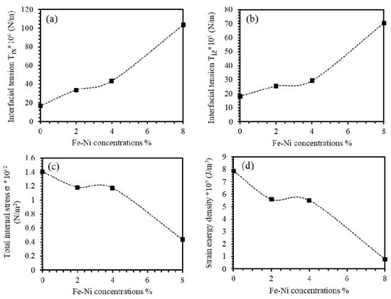 where is the bulk modulus and is the crystallite size. The value of the interfacial tension of ZnO thin film was found to be N/m2 and N/m2 for the lattice parameters ( and ), respectively. As indicated in Figure 5a,b, both and increase by increasing Fe-Ni content in the ZnO thin films. Obviously, insertion of 8% of Fe-Ni contents into ZnO thin films increase to 6.18 times that of undoped ZnO thin film. Nonetheless, for the same Fe-Ni concentration, the rises to 3.88 times that of undoped ZnO thin film. The ratio is 1.592, which is consistent with the axial ratio c/a as demonstrated in Figure 2. The internal stresses occur because of many reasons, such as temperature variations, phase transitions, and deformations. The value of the total internal stress () is defined by Young’s Modulus (E) of the material and the micro strain by the relation . The value of the total internal stress of ZnO thin films was found to be N/m2. It decreases by introducing Fe-Ni co-doping into ZnO thin films as displayed in Figure 5c. The value of the strain energy density within thin films [] depends on the Young’s modulus of the film, the volume of the unit cell and the internal micro strain, . The strain energy density can be expressed as [44,52],