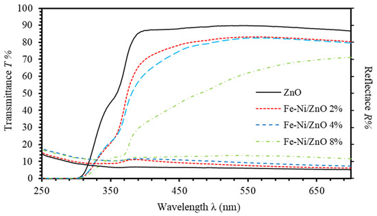 Figure 6 shows the transmittance and reflectance spectra of the undoped ZnO and the Fe-Ni co-doped ZnO thin films for various Fe-Ni concentrations. Clearly, as-grown thin films are found to exhibit high transparency in the range except for the 8% Fe-Ni co-doped ZnO thin films. The transmittance values of the undoped ZnO thin films in the visible region were found to be about 87%. Introducing Fe-Ni content into ZnO thin films was found to decrease the transmittance values. The 2% and 4% Fe-Ni co-doped ZnO thin films were found to adopt low values of transmittance in the middle of visible range (about 83% and 82%), respectively. We found that 2% Fe-Ni co-doped ZnO thin film are transparent. However, 8% Fe-Ni co-doped ZnO thin films were found to display the lowest transmittance (approximately 60%). Moreover, optical absorption edge is found to shift into the red region upon introducing Fe-Ni contents into ZnO thin films. Therefore, a considerable decrease in band gap energy is achieved. Several reasons can be identified for the observed band gap energy decrease such as, the Fe/Ni-related charge transfer transition in the case of Fe-Ni co-doped ZnO, the enhanced sp-d interactions between the band electrons of ZnO and the localized d electrons of iron and nickel, and the strong mismatch between the electronegativities of Fe, Ni, and Zn in the ZnO system [54,55,56,57,58]. The reflectance was measured by UV-Vis spectrophotometer. Similar interpretation could be applied to the reflectance spectra with reverse behavior to those of the transmittance spectra as demonstrated in Figure 6. We found the reflectance of ZnO thin films to be around 6% when a 500 nm light is incident on the films. Upon introducing Fe-Ni contents into ZnO thin films, reflectance rises to around 13% at 8% of Fe-Ni co-doping level. Past the absorption brink, transmittance and reflectance sum up to unity indicating minimum scattering of the incident light as confirmed by the XRD patterns in Figure 1 [59,60,61].