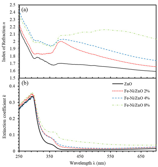 where is the absorption coefficient given by and stands for the thickness of thin film that was found to be 500 nm. The index of refraction () as a function of the wavelength of incident light is shown in Figure 7a. The values of of undoped ZnO thin film assumes values in the range 1.6–1.7. As Fe-Ni content increases, increases to around 2.1 at 8% Fe-Ni co-doping level. This could be interpreted in terms of the presence of institutional additives as more Fe-Ni content is introduced in the films that increases the reflectance. Moreover, the surge in the refractive index of Fe-Ni co-doped ZnO thin films can be attributed to the solidification of smaller ions into larger collections [62]. Figure 7b shows the extinction coefficient () of ZnO and the Fe-Ni co-doped ZnO thin films. The index k increases as Fe-Ni concentration increases in the detectable region. It is clearly seen that ZnO film has a minimum constant value (0.02) all over the visible range. However, the Fe-Ni co-doped thin films were found to attain exponentially decreasing trend indicating the presence of Urbach absorption tail.
