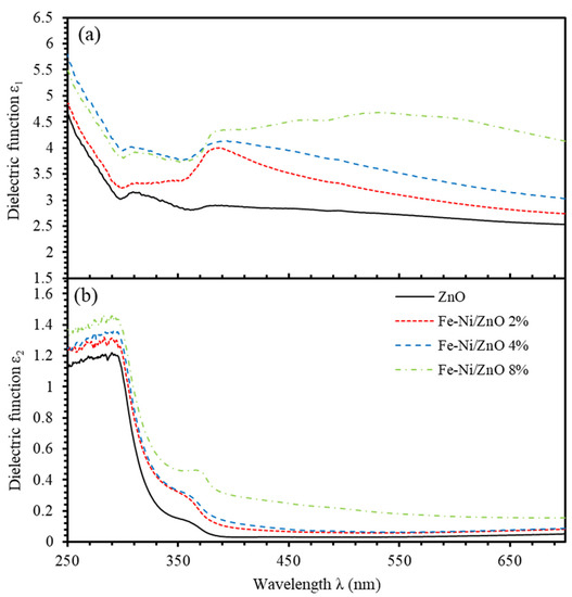 The complex dielectric function is correlated with refractive index () by . The computation of dielectric function is done in terms of optical constants n and k, that are related to the real (ɛ1) and imaginary (ɛ2) parts of the dielectric function by the relations: and [63]. Figure 8 shows and of undoped ZnO and Fe-Ni co-doped ZnO thin films as functions of incident wavelength for different Fe-Ni co-doping levels. Similar argument applies to the complex dielectric function that exhibits a behavior similar to that of the refractive index. We found that, introducing Fe-Ni contents into ZnO thin films increases the dielectric functions.