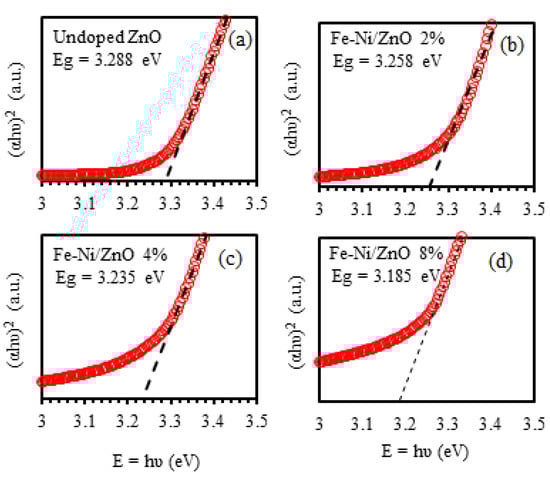 Tauc of (a) undoped ZnO, (b) 2%, (c) 4% and (d) 8% of Fe-Ni co-doped ZnO thin films.
