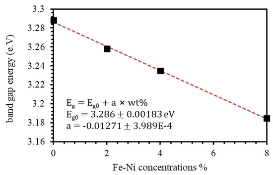 The crystalline density (N) of ZnO Fe-Ni co-doped ZnO thin films can be calculated from the estimated values of crystallite size (D) and given by [47,48], where t is the film thickness found to be 500 nm. Figure 4b shows the crystalline density of undoped ZnO and Fe-Ni co-doped ZnO thin films as a function of Fe-Ni concentration. The value of (N) of ZnO thin films was found to be cryst./cm2. This value was decreased to cryst./cm2, cryst./cm2, and cryst./cm2 upon introducing 2%, 4%, and 8% Fe-Ni co-doping levels Ni, respectively.