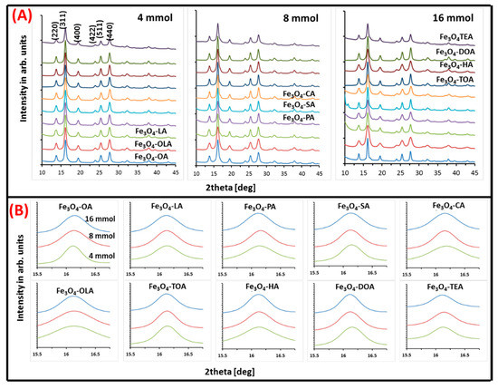 (A) Three series of X-ray diffraction patterns of obtained nanoparticles. Each series shows nanoparticles with specific concentrations of tested surfactants; (B) zoom on (311) peak in respect to surfactant and its concentration.