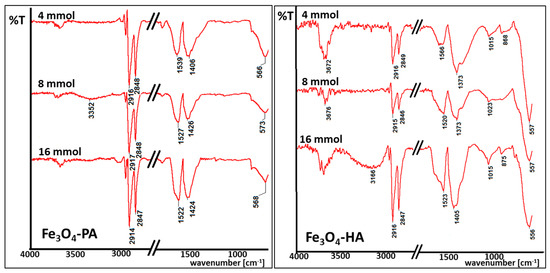 IR spectra of magnetic nanoparticles coated with palmitic acid (Fe3O4-PA) and hexylamine (Fe3O4-HA) in tested concentrations.