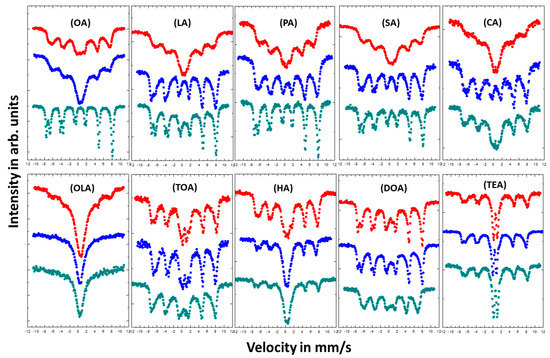 As seen by collected Mössbauer spectra presented in Figure 5, magnetic response of each type of nanoparticle varies dependent on nanoparticle size and surfactant concentration, which is directly correlated to particle–particle interaction via surfactant layers. Surface stabilizers change growth regime in relation to its concentration in reacting volume. In addition, stabilizers can prevent the oxidation process during preparation of the nanoparticles. The shapes of the spectra measured for nanoparticles coated with OA, LA, PA, SA, and CA change from a broad sextet typical for superparamagnetic fluctuation of Fe magnetic moments for low concentration of the surfactant (4 or 8 mmol), to the spectra typical for bulk magnetite which can be described as superposition of the two sharp subspectra with distinguished hyperfine parameters (for 16 mmol). This comes from the Fe atoms located in the [A] and [B] position in the magnetite invers spinel structure [44]. Such conversion of the spectral shapes means that the increase of surfactant concentration led to the suppression of the superparamagnetic fluctuation of the Fe magnetic moments. For OLA, TOA, HA, DOA, and TEA the influence of surfactant concentration on the shape of the spectra is rather small. It was expected that the increase of the surfactant concentration should increase the superparamagnetic fluctuation because of the weakening dipole–dipole interaction between nanoparticles. That is related to the rise of the distance separating objects. Such scenario is also preventing the agglomeration process, which easily appears among magnetic grains. Our observations have shown the contrary.