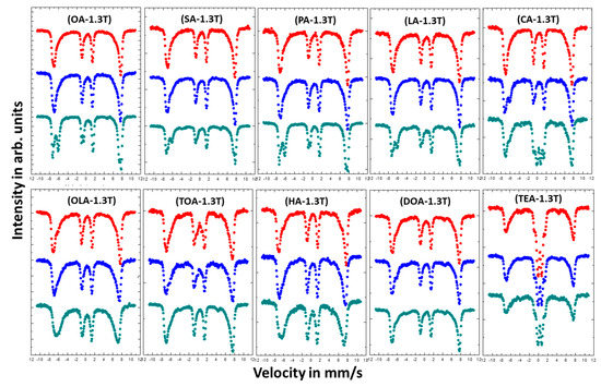 Studies on the effect of coating on magnetic properties of magnetite nanoparticles were conducted by room temperature (RT) Mössbauer spectroscopy. Figure 5 shows measured spectra, which are depicted in a series depending on used surfactant and its concentration. The Mössbauer spectra present in Figure 6 were measured at RT in an external magnetic field of 1.3 T parallel to gamma beam direction.