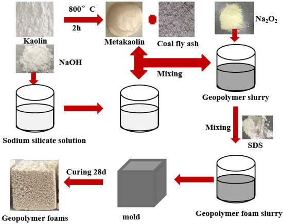 Geopolymer, firstly proposed by Davidovits in the 1970s, is an amorphous three-dimensional network structure gel [9], which is produced by synthesizing pozzolanic compounds or aluminosilicate source materials with highly alkaline solutions [10]. With the advantages of high thermal stability, excellent freeze-thaw resistance, low production cost and CO2 emissions, geopolymers seem very suitable to prepare inorganic foam materials and show a promising future in the field of fire protection [11]. Factually, metakaolin (MK)-based GFs exhibit remarkable fire-resistance, owing to the conversion of the amorphous MK-based geopolymer gel to ceramics during the fire-resistance tests [12,13]. However, the mechanical strength of MK-based geopolymer foams is lower than that of aerated concrete or foam ceramics with the same bulk density. The MK-based GFs with low bulk density usually signify low mechanical strength, which could possibly restrain their wide application. Many studies have been conducted to improve their mechanical strength. Some studies focus on the relationship between the pore structure and the mechanical properties of foam materials, showing that the mechanical behavior of the material is mainly influenced by the air-voids [14,15,16]. Meantime, researchers found that the dry density, water content, curing conditions and foaming agents can also affect the compressive strength by discussing various geopolymer formulations [17,18]. In fact, investigations on improving the strength of geopolymers have never stopped.