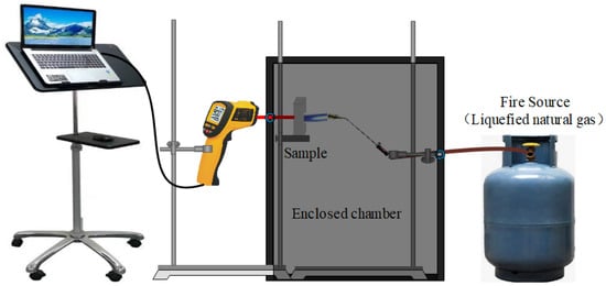 Figure 2 shows the setup for the fire-resistance test. During the test, a selection of 20 mm-thick GFs were exposed to a 1100 °C flame, and the back-side temperatures of the specimens were determined by an infrared thermometer (Xima AR882+, Dongguan Wanchuang electronic manufacturing co. Ltd., Dongguan, China).