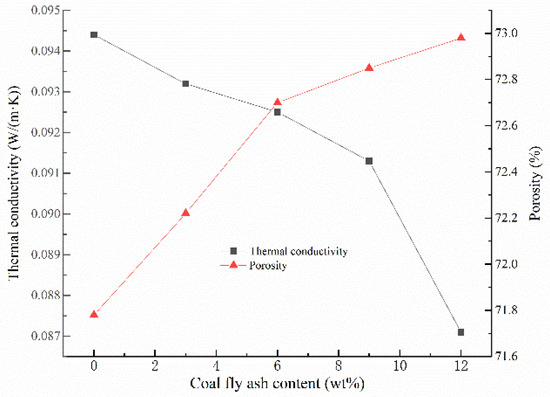 Generally speaking, the thermal conductivity of GFs is mainly related to the materials porosity and pore distribution [28,35]. As can be seen from Figure 4, when the addition amount of CFA increases from 0% to 12%, the thermal conductivity of GFs declines from 0.0944 W/(m·K) and 0.0871 W/(m·K), which is close to the results in the present study [36,37]. In fact, the increase of porosity reduces the volume of the skeleton structure, and the thermal conductivity of it is much higher than that of the air within the voids, resulting in a higher thermal insulation effect of the whole GFs [38,39]. Meantime, the addition of CFA improves the rheological property of the geopolymer slurry and makes the pore distribution in the hardened blocks more uniform, which leads to a reduction in the thermal conductivity of GFs. In addition, the hollow microsphere in CFA can also promote the thermal insulation performance of GFs [23]. Considering the non-flammable character and contribution to environment, GFs could be strong candidates for non-load-bearing insulation structures.