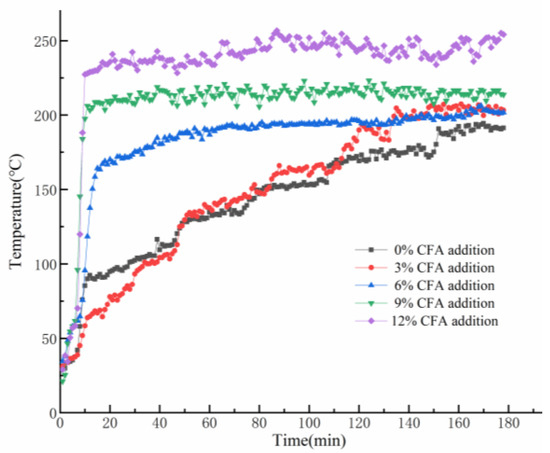 In fact, the pore structure of the geopolymer foam specimen with CFA addition has been more serious shrinking and appears more inhomogeneous after the fire-resistance test, leading to the obvious rises of the final reverse-side temperature. Fortunately, the conversion of MK-based geopolymer gel to ceramics has helped to maintain the main skeleton structure stability of the GFs with the CFA addition. GFs with the CFA addition still exhibit excellent fire-resistance, and the back-side temperatures are always within 250 °C after the fire-resistance test.
