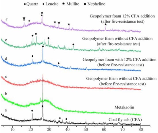 XRD patterns of the raw materials, selected geopolymer foam specimens before and after fire-resistance test are presented in Figure 6. Before the fire-resistance test, the main phase in GFs is amorphous geopolymer gel (Figure 6c,d). Meanwhile, quartz is detected in both CFA and geopolymer foam specimens with 12% CFA addition (Figure 6a,d). After the fire-resistance tests, nepheline has been found in the XRD pattern of the geopolymer foam specimen without CFA addition, while mullite and leucite appear in the geopolymer foam specimen with 12% CFA addition. The transformation of the amorphous skeleton materials to ceramic phases is beneficial to maintain porous-structure stability and excellent thermal insulation performance of GFs under a high temperature. The difference in ceramic phases between Figure 6e,f results from the addition of CFA: (1) the composition of GFs has been changes by CFA addition; (2) the viscous sintering temperature of the geopolymer matrix could be reduced, owing to the impure chemical components and lower melting point of the CFA.