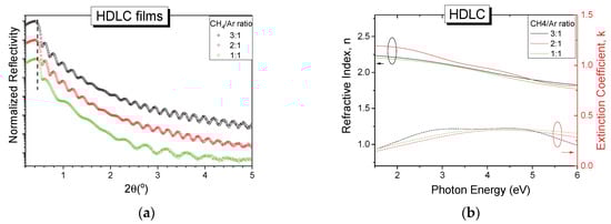 (a) Normalized X-ray reflectivity (XRR) patterns (with vertical shift for clarity) and (b) optical constants n, k for pure hydrogenated diamond-like carbon (HDLC) thin films deposited with different CH4/Ar gas ratio.