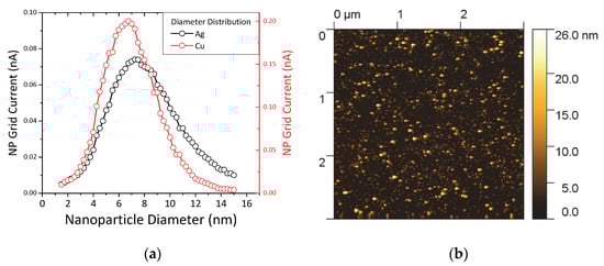 (a) Grid current intensity versus nanoparticle (NP) diameter for silver (black circles) and copper NPs (red circles). (b) Atomic force microscopy (AFM) image of pure Ag NPs on Si wafer.