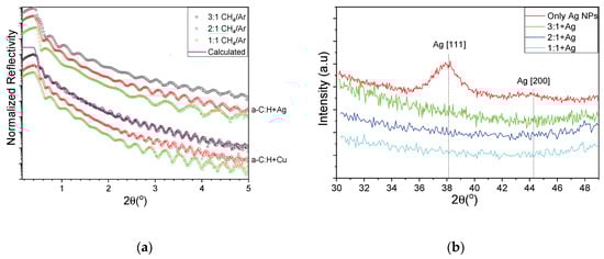 (a) XRR curves for HDLC containing Ag (top group) and Cu (bottom group) and (b) grazing incidence X-ray diffraction (GIXRD) patterns of pure NP film (red) and HDLC nanocomposites of varying CH4/Ar ratio.