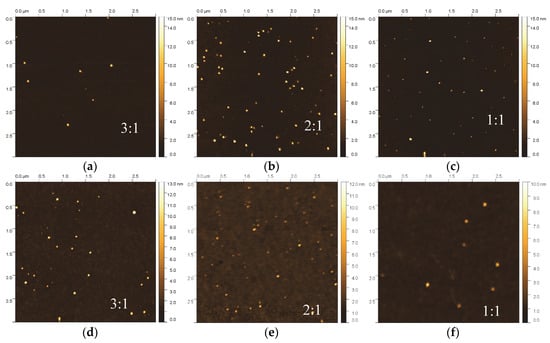 (a) AFM 3 μm × 3 μm scans for HDLC/Ag (a–c) and (b) HDLC/Cu (d–f) samples grown at various CH4/Ar ratios (3:1, 2:1 and 1:1).